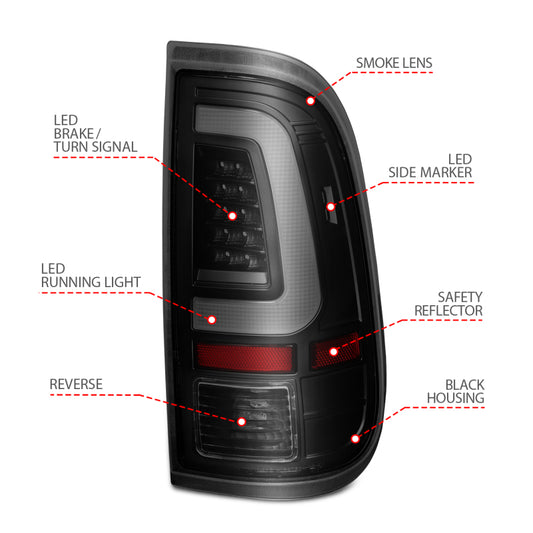 ANZO 2008-2016 Ford F-250 LED Tail w/ Lights Bar Black Housing Smoke Lens