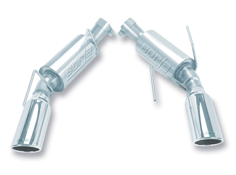 For over 4 decades, BORLA? Exhaust has been the choice of Mustang experts, from the Cobra-R SVT Mustang to the Ford GT. Major players in the racing industry and leading tuners from Roush, Steeda, Saleen and Ford Racing to the Shelby 427 Cobra have relied on BORLA?. This awesome Axle-Back system bolts on, is lighter than the factory system, includes our famous ?S-Type? mufflers with outstanding flow numbers that generate great power enhancements, and features bright chrome on T-304 stainless steel tips. These attributes, coupled with an aggressive sound of power and awesome big tip, proclaim this Stang is all business. Airflow management and exhaust engineering is a science with which BORLA? has more experience than anyone in the exhaust aftermarket. The performance matches the famous BORLA? systems of the past but with a unique muffler and exhaust configuration canceling additional high frequency sound waves. Delivering a significant increase in CFM from the factory system which, as most engine builders will confirm, accounts for the dramatic power improvements. Perhaps more importantly, this added flow maximizes performance for other aftermarket enhancements installed on the Mustang because all BORLA? exhaust products are tuned for maximum output from any aftermarket performance upgrade. Two Axle-Back options are also available: an aggressive ?S-Type? (PN 11750) and a more mellow Touring (PN 11752) ? both replace only the over-the-axle pipes, mufflers and tips. BORLA?, the original pioneers of high-quality, T-304 austenitic stainless steel (superior to 409 or aluminized steel) free-flow exhaust utilizes patented award and race winning technology to deliver quality, sound, performance gains and enhanced fuel economy ? all with an easy bolt-on installation. Unsurpassed written Million-Mile Warranty.