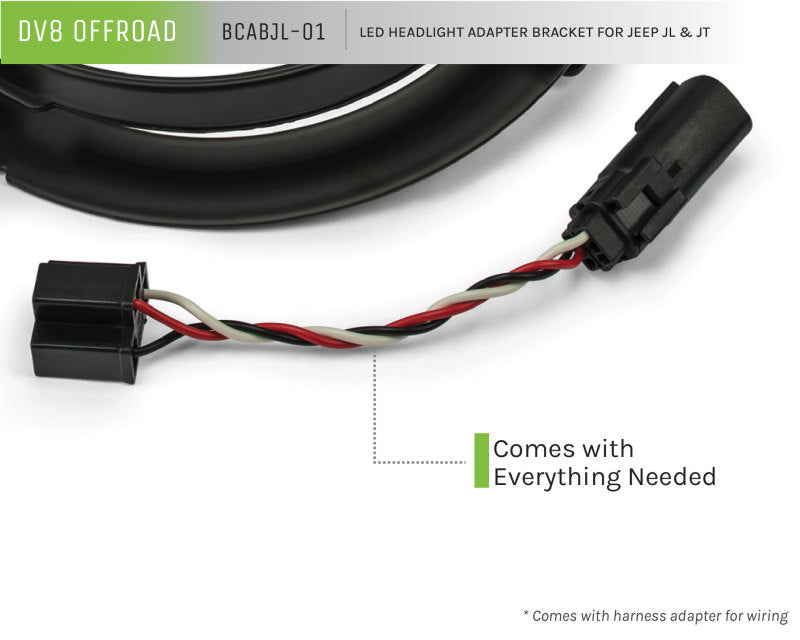 The DV8 Offroad BCABJL-01 is an adapter kit to fit 7? JK or TJ headlights onto a Jeep JL and Gladiator. Let?s face it, there are a lot of really cool and inexpensive 7? headlights for older generation Jeeps but not so many 9? lights to fit the JL and Gladiator. With this kit you have everything you need to mount aftermarket headlights into your Jeep! Plug and play. Comes with harness adapters for wiring. Will work with any 7? JK or TJ headlight. Adjustable like OEM.
