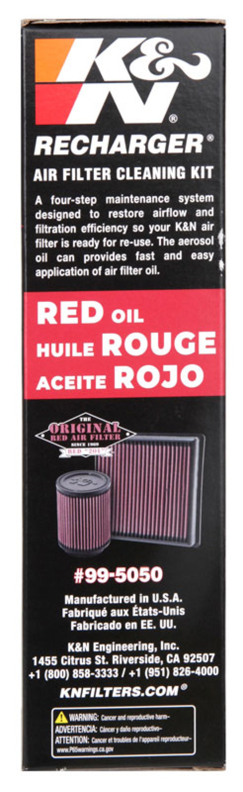 K&N Recharger Kit 99-5050 is designed for cleaning your K&N oiled cotton air filter when it is time to be serviced. The kit comes with K&N Power Kleen air filter cleaner and K&N air filter oil. 99-5000 will restore air flow efficiency and will bring your K&N oiled cotton air filter to like new condition. K&N Power Kleen works to dissolve the dirt build up and old filter oil, then it can be washed away with water. After the air filter fully dries re-oil your air filter then reinstall it. This Recharger Kit comes with an 8 ounce squeeze bottle of oil and a 12 ounce K&N pump bottle of Power Kleen air filter cleaner.