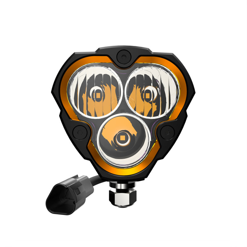 The small and mighty KC FLEX ERA 3 features an optimized compact triangular design with best in class light output. Designed for flexibility, you can change beam patterns and style easily with swappable lens optics, bezels, and covers. Ushering in a new ERA in off-road lighting, The FLEX ERA 3 was born to race Baja and is a perfect complement on your next adventure. Signature triangular design provides maximum output with 3 high powered LEDs in a compact space, as compact as 2 LEDs and stronger than 4 in the same space. Changing the game, KC reinvents the traditional with an allnew form factor featuring amber backlighting. IP68 water and dust protection with a redesigned industryleading multislide Die-Cast construction. With interchangeable lens optics, bezel colors, and covers, the flexibility abounds with this new series of lights. Dual spread beam patterns with a spot beam pattern make for the best of both worlds in this high coverage combo light.